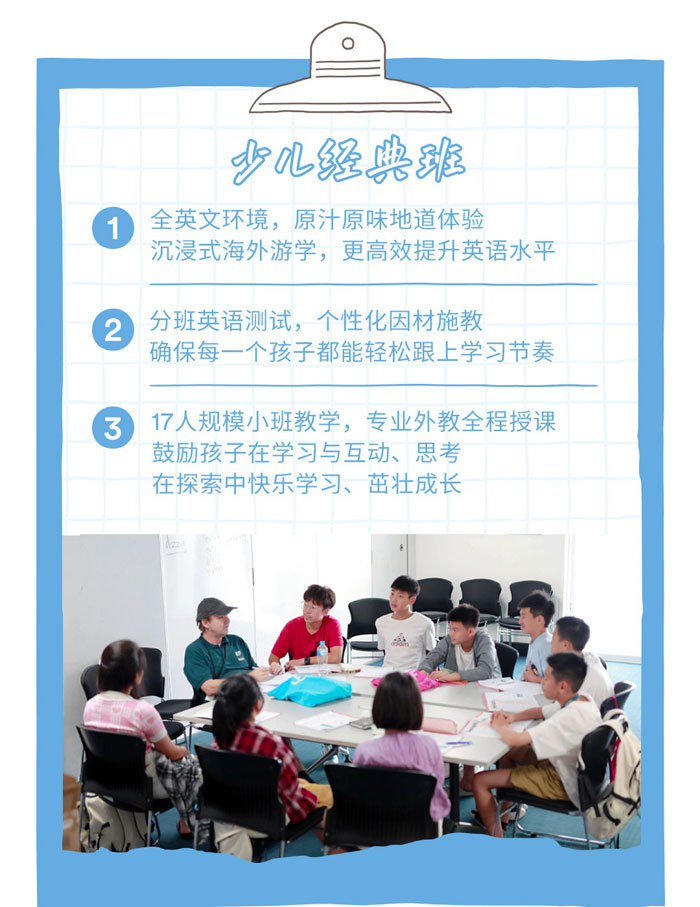 5、课程和教材:每周20课时小班外教课,搭配语言专家定制的游学教材