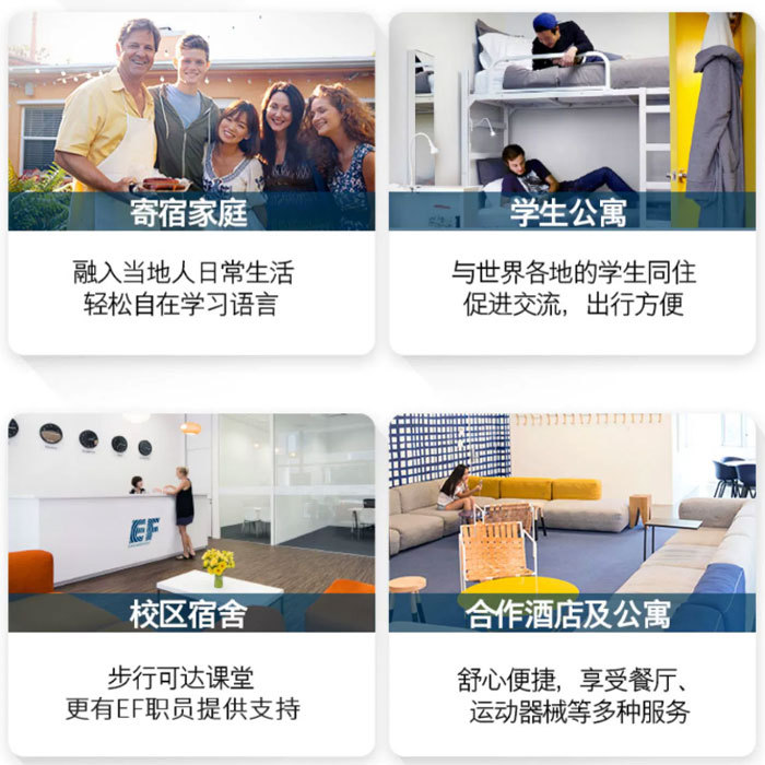 住宿标准:寄宿家庭、学生公寓、校区宿舍、合作酒店/公寓(自行选择)