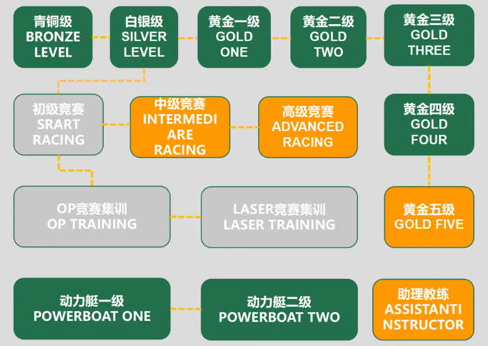 15个课程,每通过一个课程都会获得IYT颁发的等级证书(除竞赛级别外)。通过全部课程可以获得IYT颁发的白金旌旗。