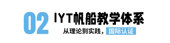 IYT全称International Yacht Training,即国际游艇培训体系,发源于加拿大,被誉为世界上普及度最高的帆船与游艇驾驶培训认证体系,在全球有216个培训中心,教学体系对场地、设备、硬件、教练资质把控非常严格。