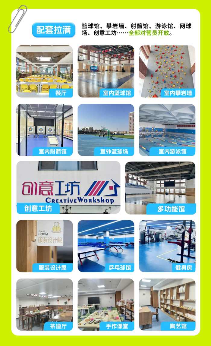 住宿区配备室内篮球场,医务室,小剧场,琴房,泳池,攀岩馆,射箭馆,击剑馆,壁球馆,图书馆,洗衣房,健身房,嘎嘎球与地壶球场地等,夏令营期间可全部开放。