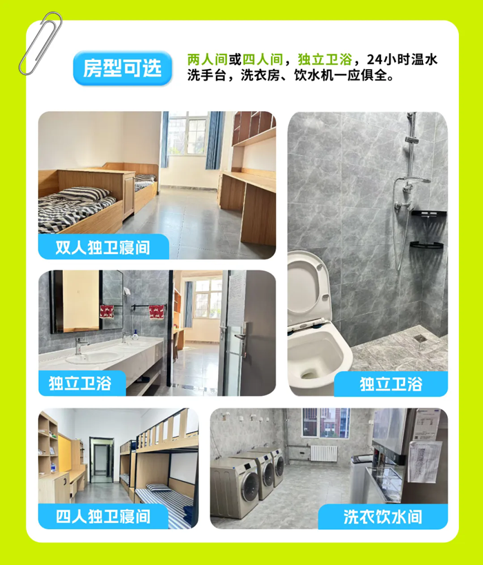 房型可选:两人间或四人间,独立卫浴,24小时温水洗手台,洗衣房、饮水机一应俱全。