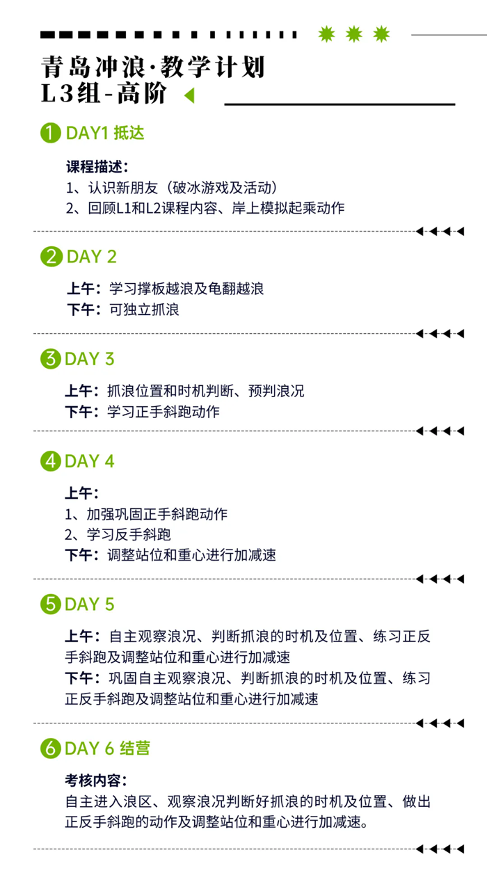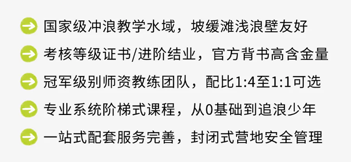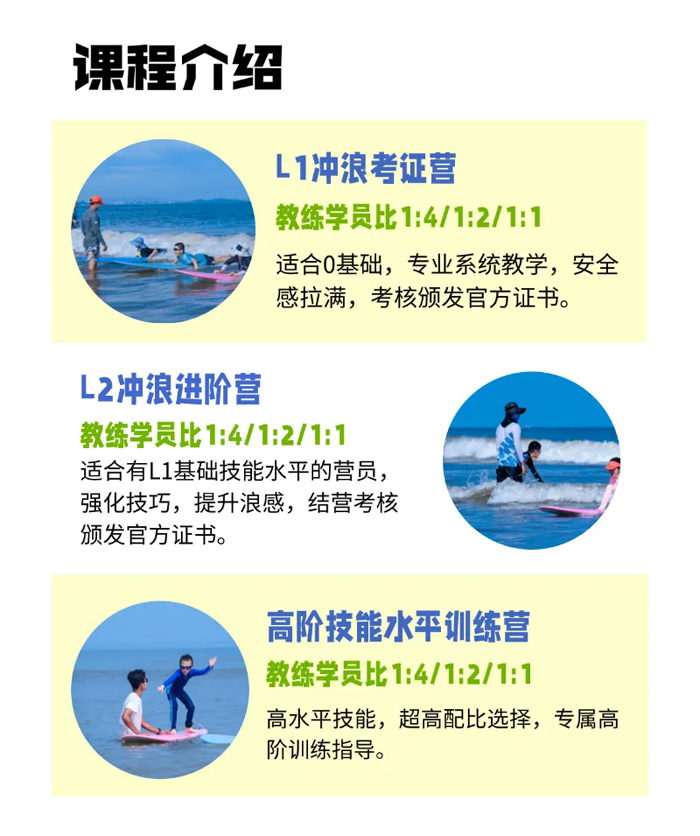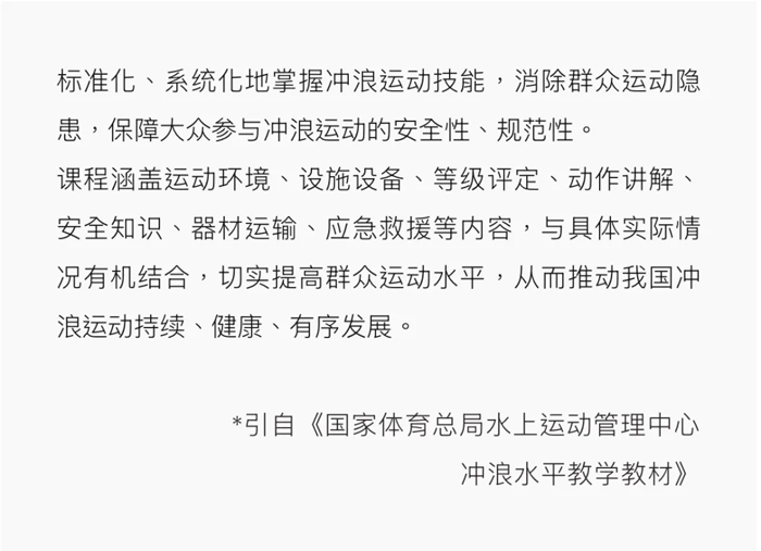 我们采用国家体育总局水上运动管理中心冲浪水平教学标准,课程涵盖运动环境认知、设施设备使用、安全知识、动作拆解、应急救援等内容。