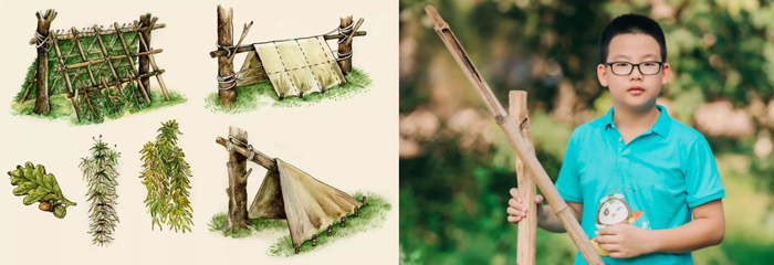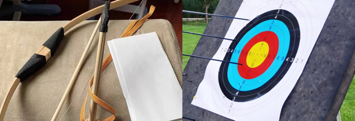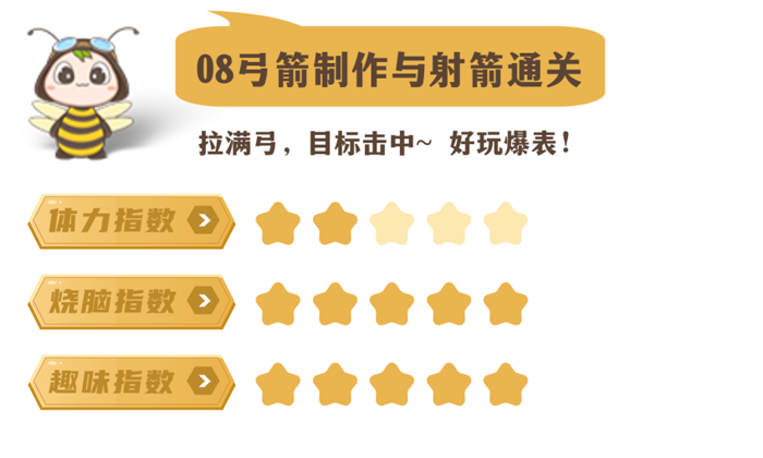利用木头、竹子、带子、砂纸等简单的工具,制作可用于狩猎的弓箭。使出全部力气,拉满弓,当当当,目标击中!