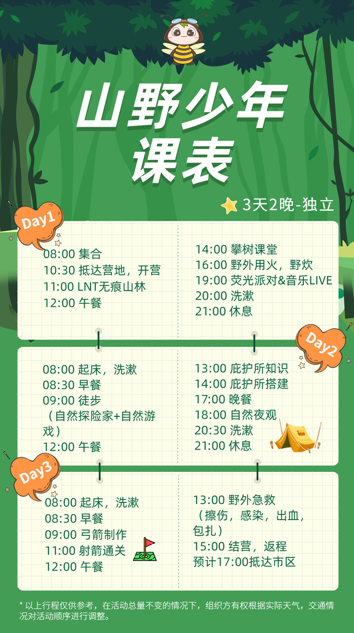 费用包含:营期内交通费、活动费、课程费、场地费、住宿费、餐费、保险费、任务道具、学习资料、活动物料、随队老师工作补贴等。