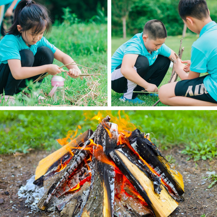 野外生火可以有很多花样,我们希望孩子们掌握的是就地取材简单容易上手的方法。比如当我们走在潮湿的树林里,即使用潮湿的树枝树叶也可以燃起一堆取暖的篝火;当我们没有火柴也没有打火机,但是随身只带着一些医用棉球也可以就地取材,可以生火做饭......