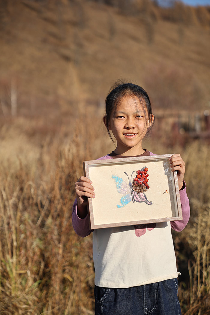 我们捡拾到许多野花和不同形状的叶子,还有松果,回到猎民点,沐浴着阳光,做创意画,将《森林的寄语》带回家。