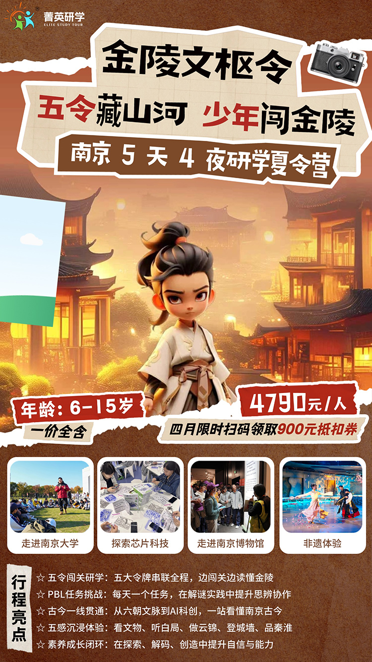 金陵的万千气象,凝练成五枚令牌:文脉、登科、城防、博爱、凌云。它们,是通往城池骨髓的五把钥匙,也是五天探索的荣耀路标。青少年们将以文枢使者的身份,执令闯关:在博物院解码国之重器,于科举场洞察千年选贤,登明城墙推演攻防战略,临长江畔感悟家国情怀……每一步,都是对“天下文枢”的深度叩问;每一令,都是对自我能力的淬炼加冕。