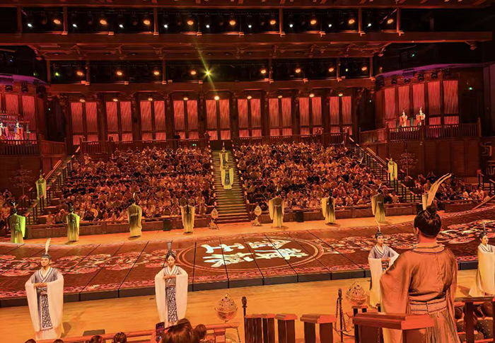 场景概述:《金声玉振》大型演艺活动,以“礼乐文化 ”作 为演出主体,以“世界的孔子 ”和“孔子的世界 ” 作为立意方向,将诗、乐、舞等中国古典艺术形 式与当代艺术最前沿的舞台装置、大型机械、全 息影像等手段相结合,打造一场极其震撼、绚烂 的文化艺术力作!整场演出纵贯人的一生,演绎 出“ 由凡入圣 ”的过程,引导观众走进“风雅颂 ” 的礼乐画卷,感受明礼的典雅生活方式,融入中 华千年礼乐文明的灿烂历程。