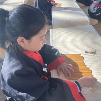 场景概述:通过研学导师对“韦编三绝”故事的讲述,激励学生以韦编三绝为镜子,倡导刻苦耐劳,勤奋勉励的学习精神。同时了解文字载体的发展历史,竹简的由来及历史价值。最后学生动手编连竹简,切身体会孔子当年“韦编三绝”的学习精神。