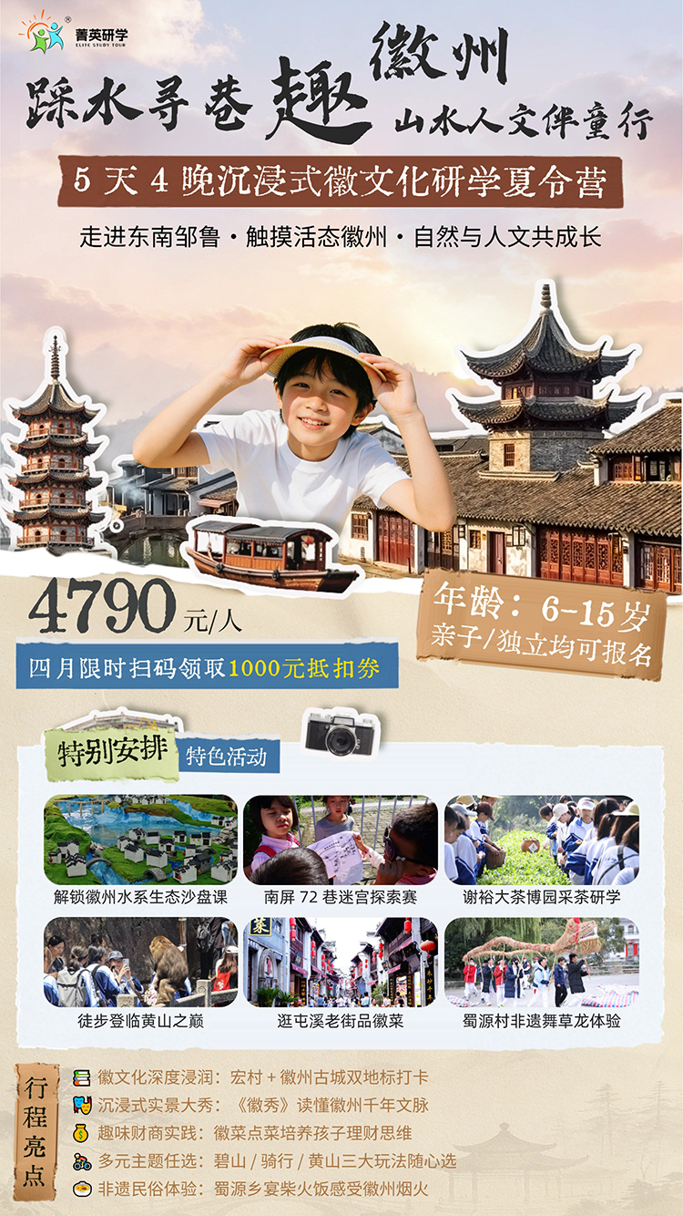 本次活动将引导学员走出课堂,深入徽州的真实场景。通过古城探访、自然观察、非遗体验、团队协作等一系列活动,学员将在行走中学习历史,在体验中感悟文化,在自然中启迪心智,收获一段知识与成长共融的夏日时光。