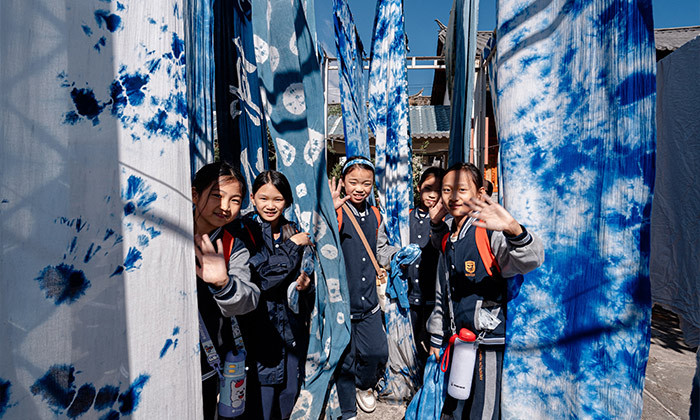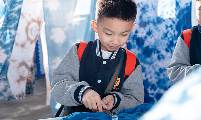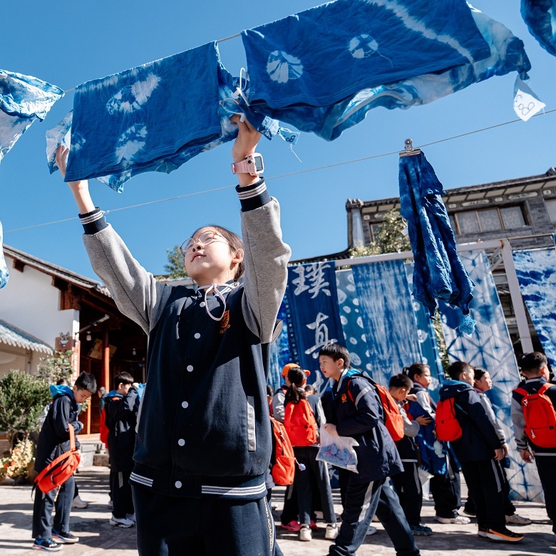 大理白族扎染作为中国古老的纺织品染色技艺,更是国家级非物质文化遗产,集自然认知、工艺实践与文化理解于一体。自然探究层面,可走进周城的板蓝根种植地,观察这种蓼科植物的生长特性,在璞真扎染博物馆见证其经熬煮、发酵制成蓝靛染料的过程,直观理解植物染料的提取原理与微生物发酵的作用,感受自然物质的转化奥秘。工艺实践中,能在传承人指导下体验“画稿—扎结—浸染—拆线”全流程,用竹夹、棉线等工具创作“太阳花”“蝴蝶”等纹样,在动手过程中体会“结的松紧决定留白大小”的工艺诀窍,培养专注力与动手能力。文化解码维度,可探究“青白配色”背后白族“清清白白”的处世哲学,了解扎染作为嫁妆的民俗内涵,还能观察传统纹样与现代文创的结合,思考非遗传承的创新路径,在蓝白浸染中深化对民族文化的认同与热爱。