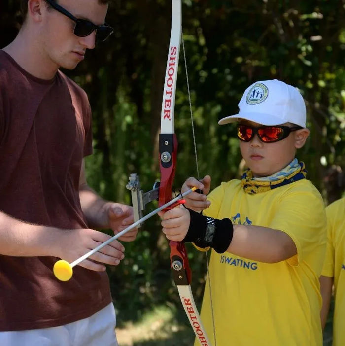 孩子们学习射箭的基本技巧,外教用英文讲解动作要领——“Stand tall, aim steady, release smooth.”