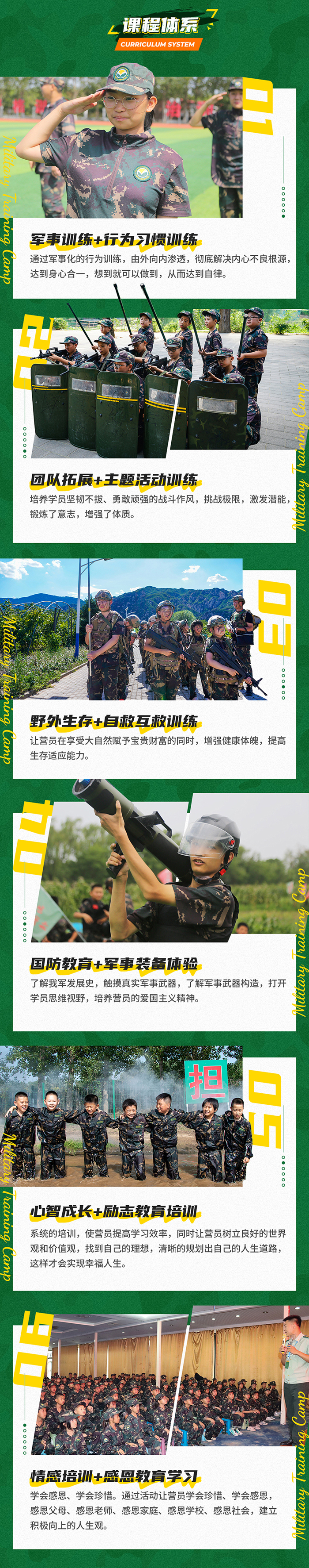 ★军事训练+行为习惯训练:通过军事化的行为训练,由外向内渗透,彻底解决内心不良根源,达到身心合一,想到就可以做到,从而达到自律;
