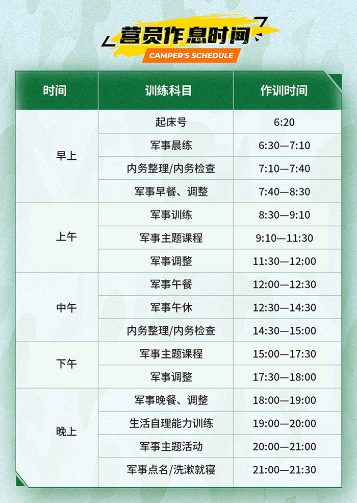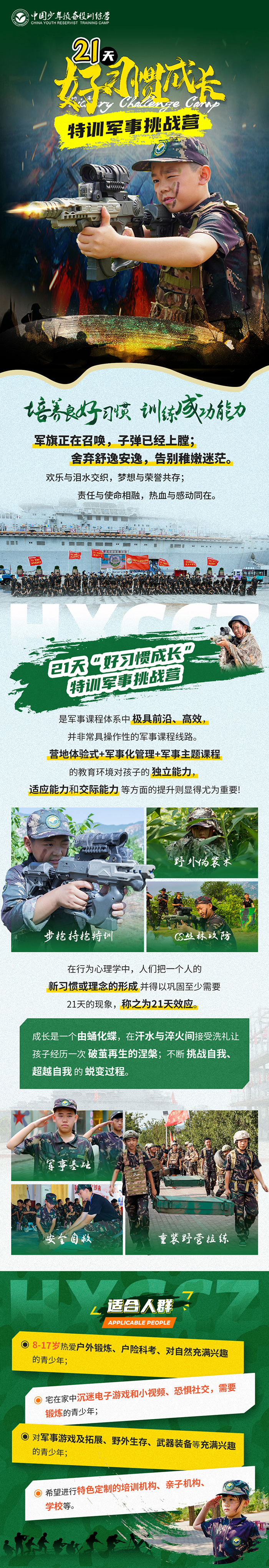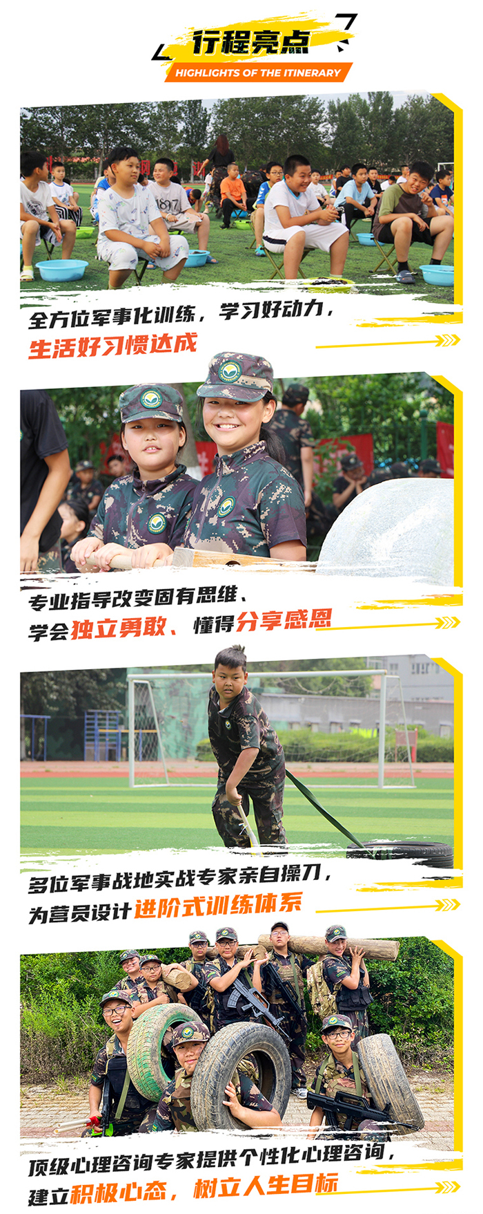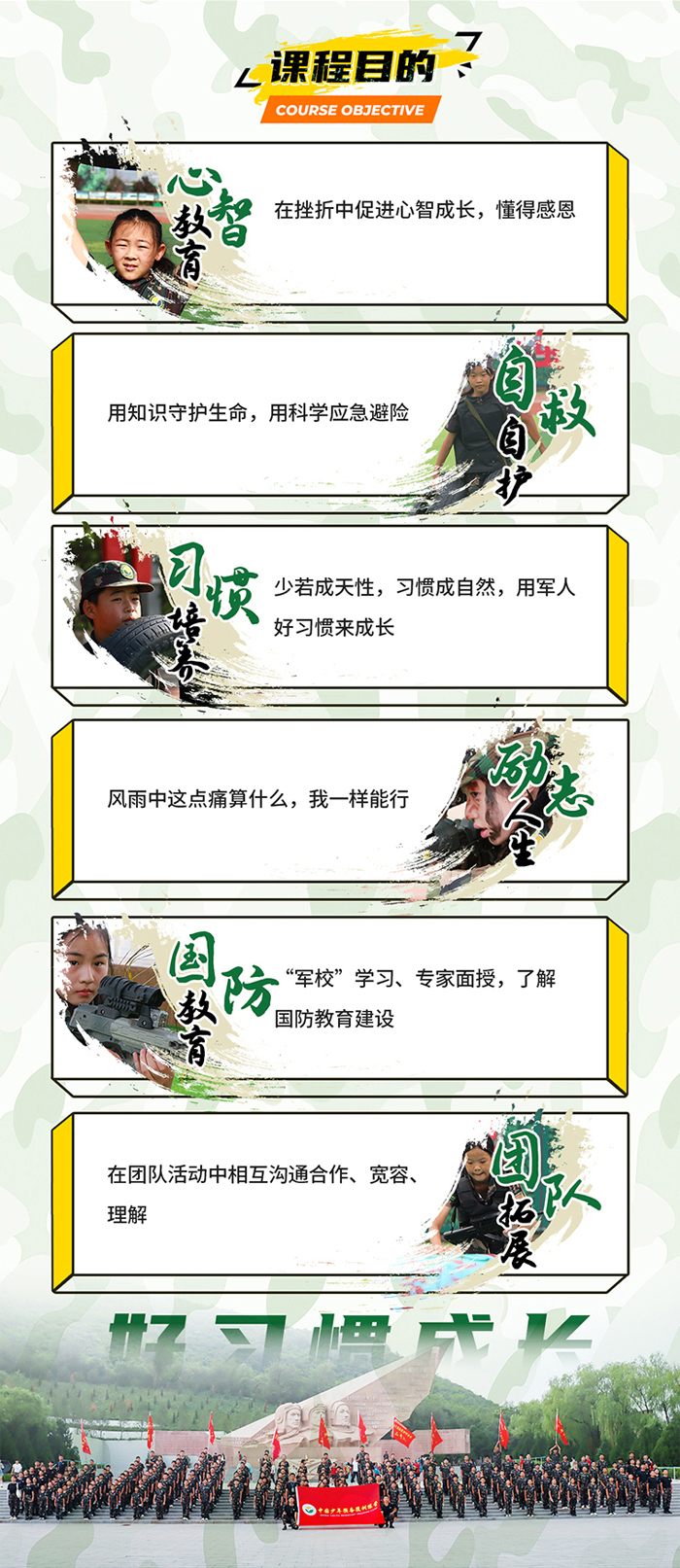 以军事基础训练、特色训练科目、军人行为品质训练、习惯养成训练为主训科目,融入军事装备体验、野外生存训练、军事励志拓展游戏、轻武器拆解教学、极限体能特训、军政教育(国防、心智、感恩)等全方位体验式系列课程,帮助营员历练坚强毅力,挖掘个人潜能,提升自理力、执行力、抗挫力,从而达到好习惯的养成。