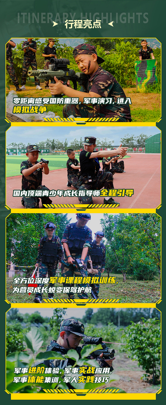 以军事基础训练主训,通过军事行为基础训练、军事拓展训练、军事特色科目训练、军事体能特训、国防教育以及心智教育等系列课程,全面培养营员的军人品质,锻炼意志增强体质,养成雷厉风行的作风及独立自主的好习惯。