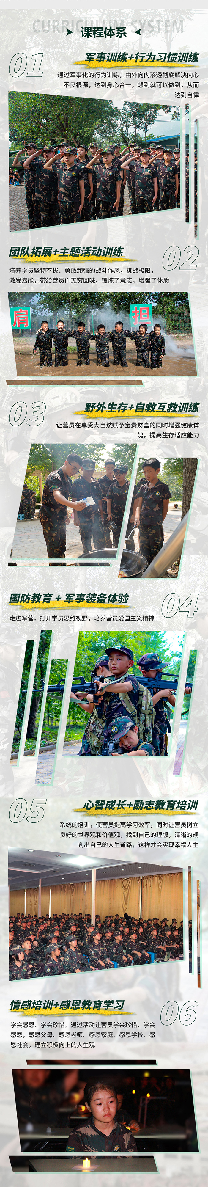 ★军事训练+行为习惯训练:通过军事化的行为训练,由外向内渗透,彻底解决内心不良根源,达到身心合一,想到就可以做到,从而达到自律;