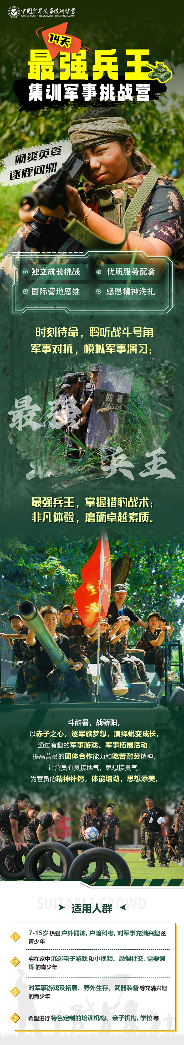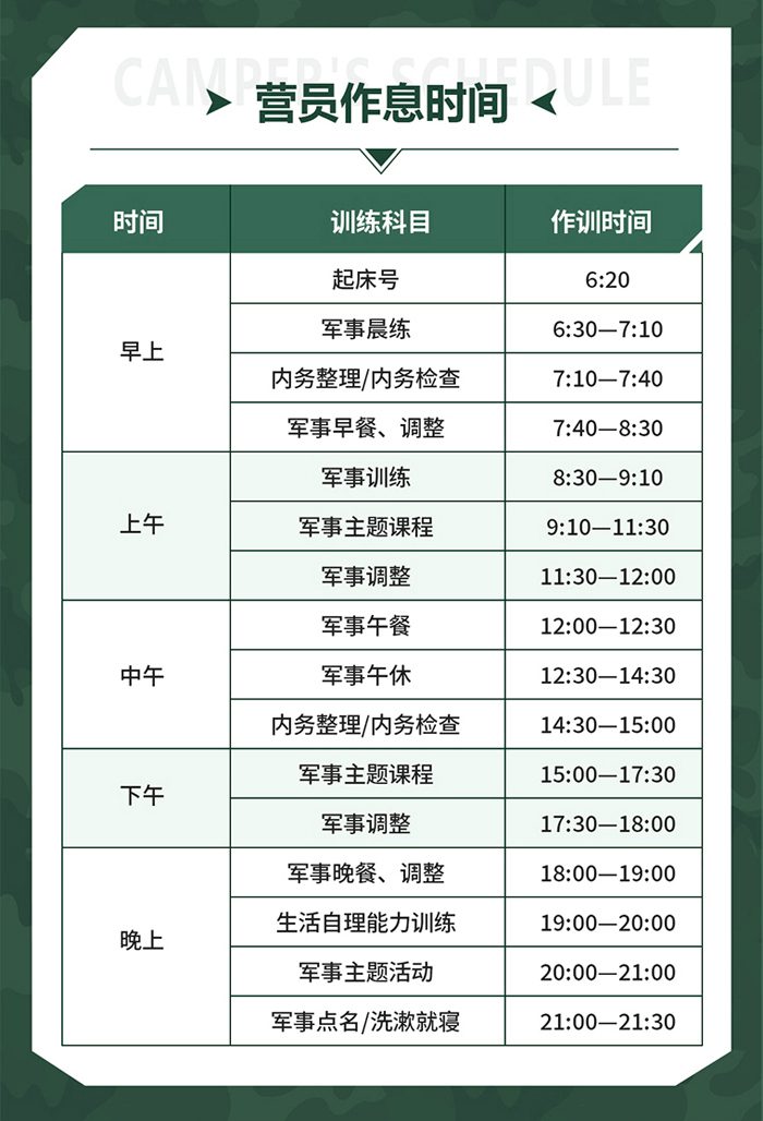 以军事基础训练为主训科目、特色训练科目(军体拳、刺杀操、旗语)为主训科目,融入军事装备体验,生活自理能力训练、野外生存训练、自救互救训练、军政教育(国防、心智、感恩)等体验式军事系列课程,让营员在实践活动中体验、感悟、反省与感恩,拓宽视野,锻炼意志,培养营员上进心。