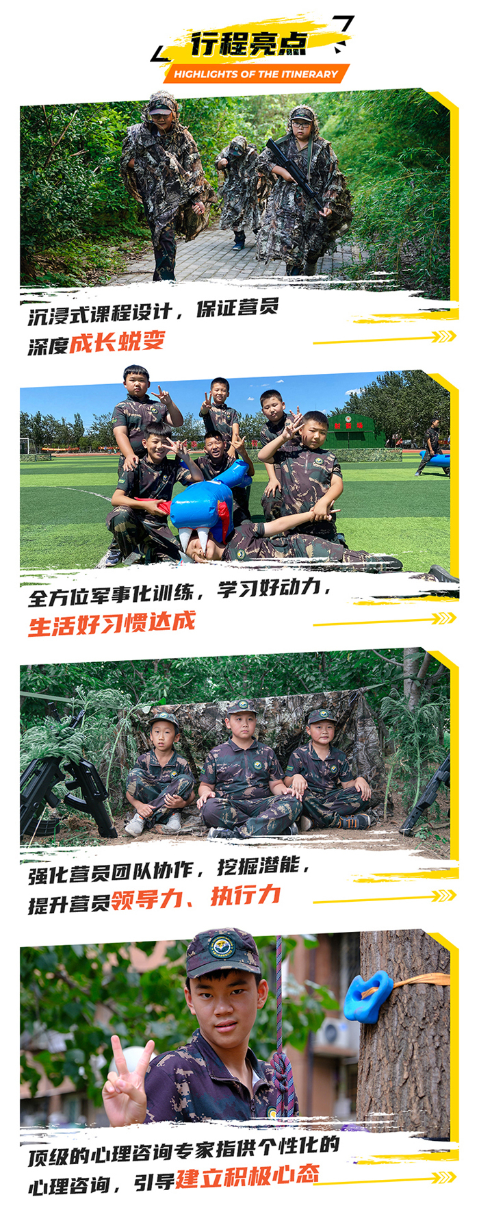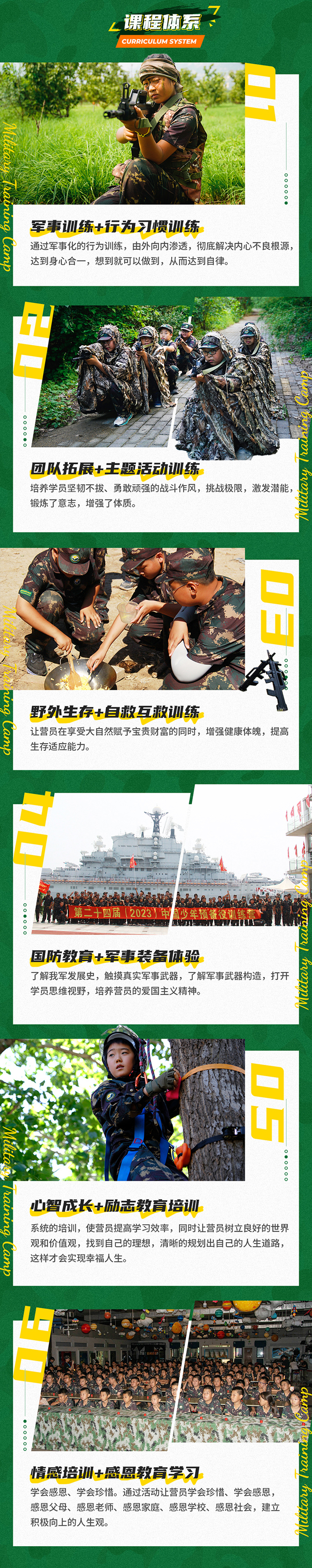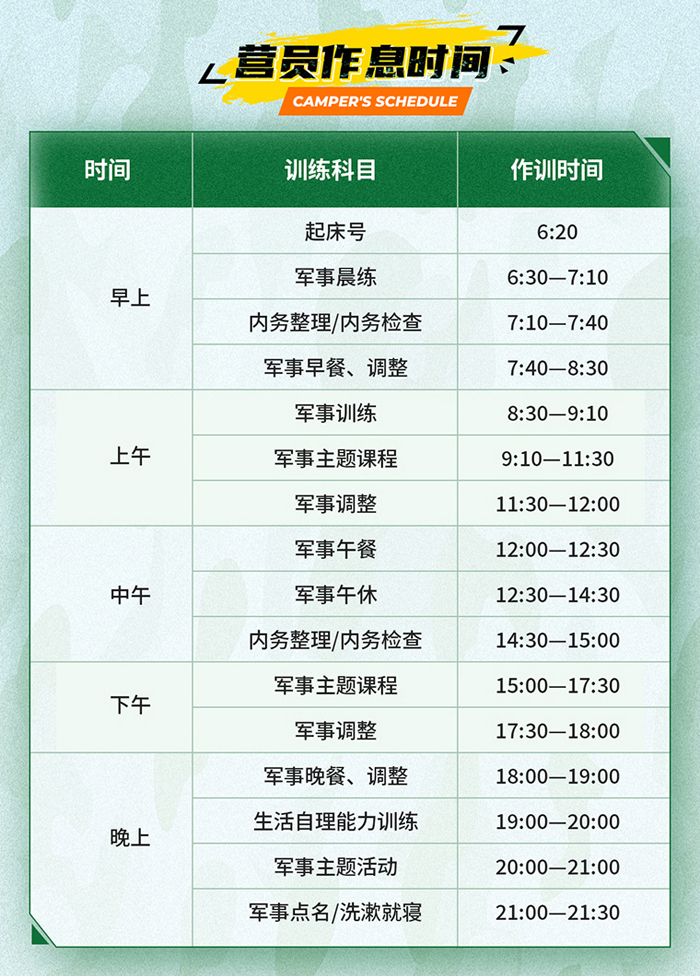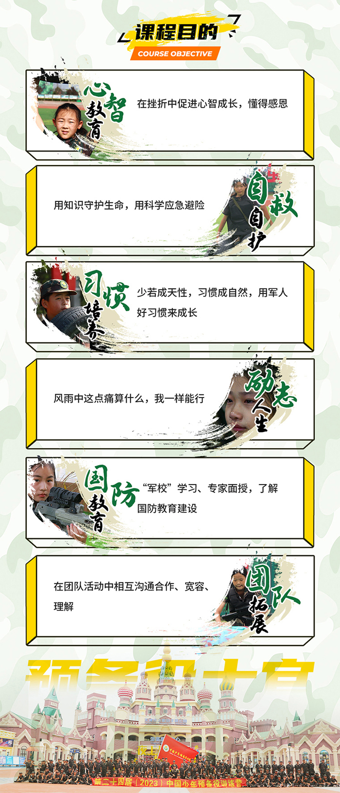 以军事基础训练、特色训练科目、军人行为品质训练、习惯养成训练等为主训科目,引入领导力培训理念,结合军事装备体验、野外生存训练、军事励志拓展游戏、武器拆解教学、极限体能特训、军政教育等全方位体验式系列课程,塑造营员的综合能力,培养军人品质,帮助营员树立正确的价值观,培养营员的社会责任、集体观念、实践精神。