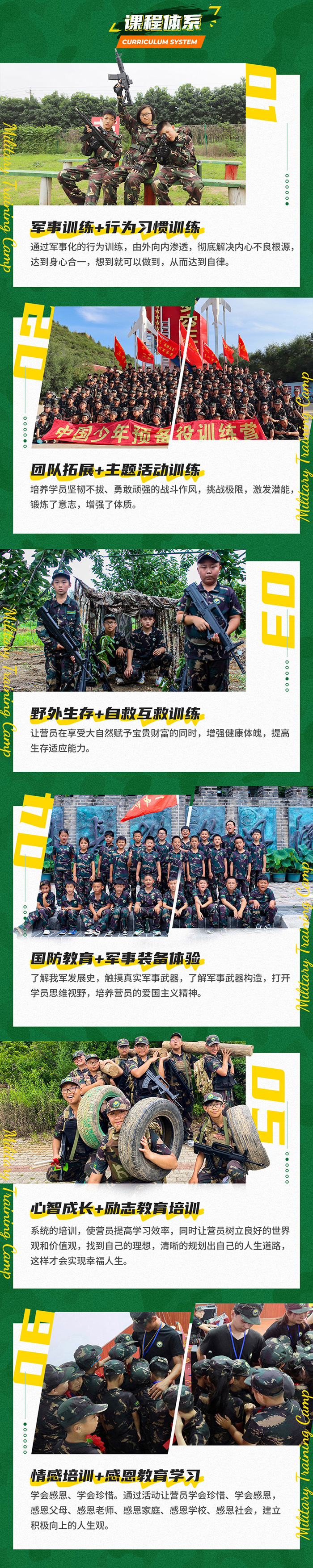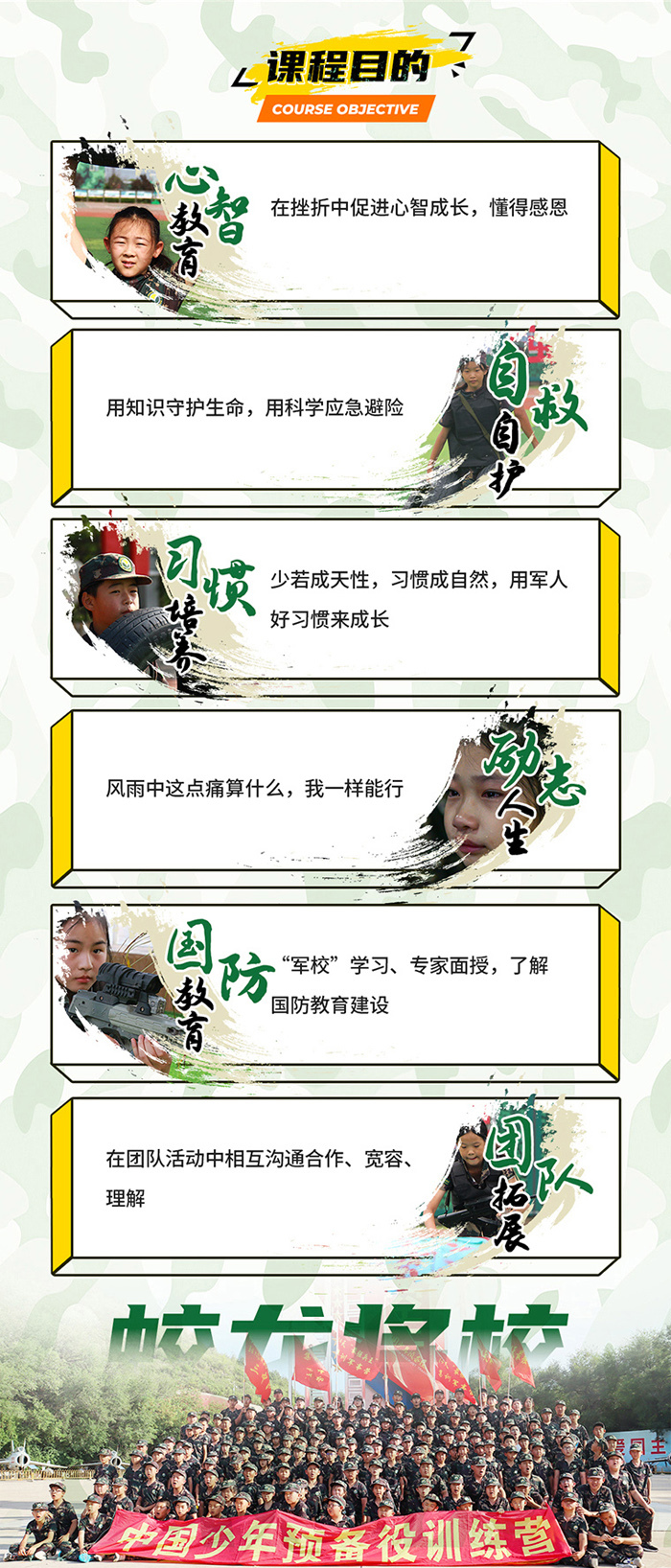 主要通过综合性沉浸式系列军事课程:军事行为习惯训练、军事游戏及拓展、野外生存、安全自救、泥潭特训、军事装备体验、军事特色科目训练(海军旗语、警棍盾牌术、野外单兵作训、体能特训、CQB战术特训等),以及国防教育、心智教育、感恩教育等,锻造逆商、塑造情商,培养雷厉风行的作风,坚韧不拔的意志力,让营员认识自我潜能,培养自信心和自控能力,增强营员的领导才能,完善人格。