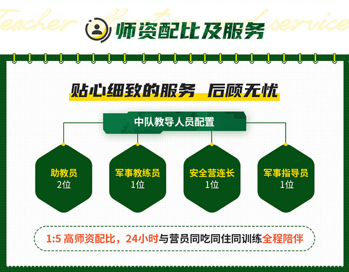 师资配比:1:5左右,中队教导人员配置:助教员2位、军事教练员1位、安全营连长1位、军事指导员1位