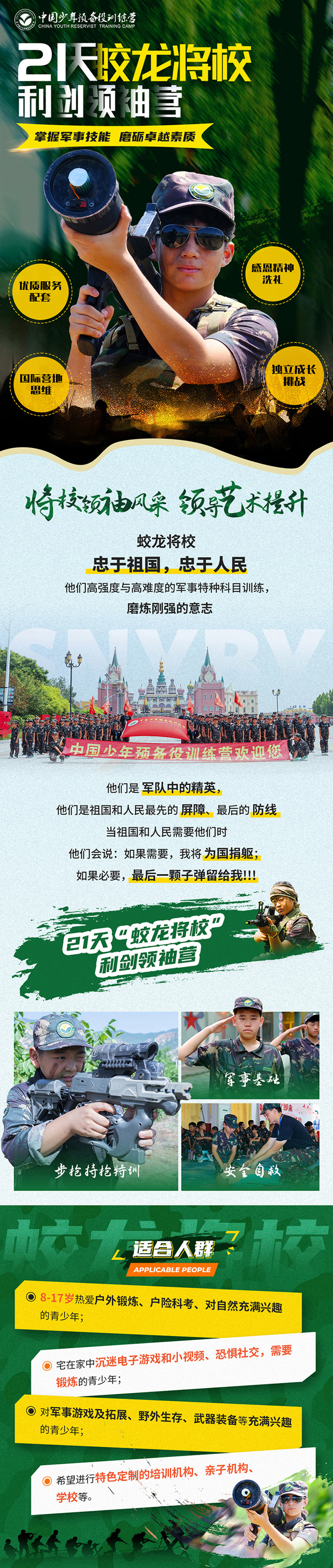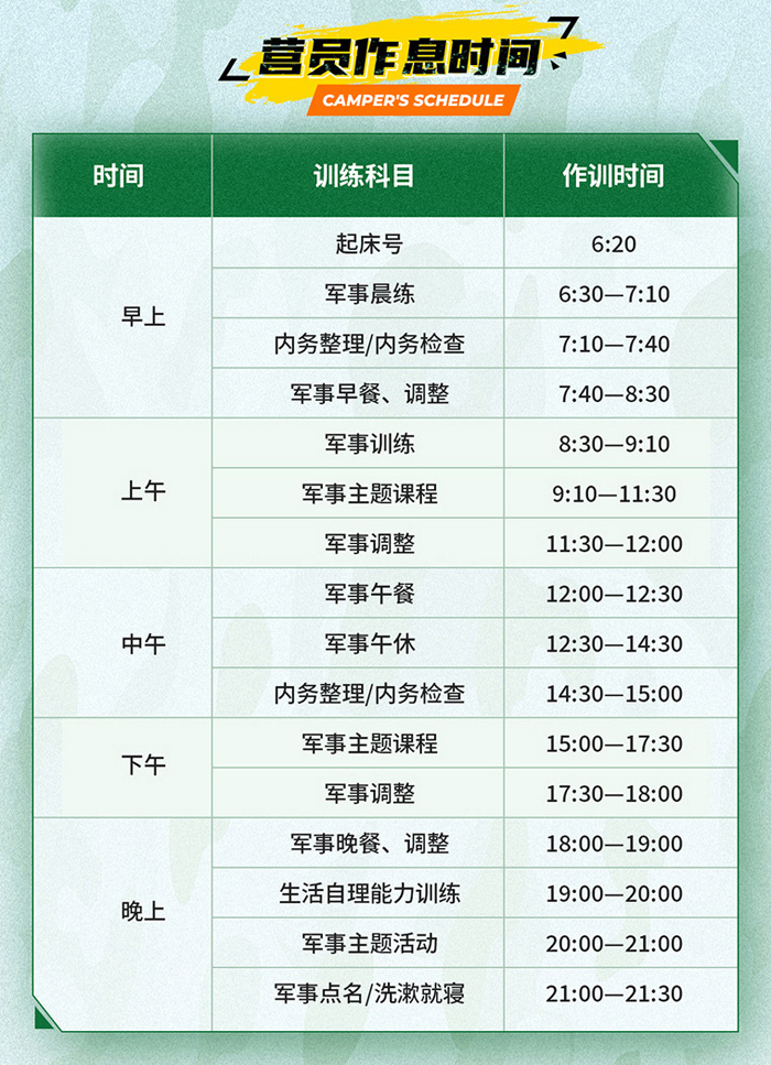 通过沉浸式的军旅主题课程活动,国际童军先进教学理念,系统化的军事课程体系,实战化的训练科目,让营员感觉更有挑战性及刺激性,激发营员领导思维及抗挫性,养成好习惯的同时多元化提升营员的综合素质。