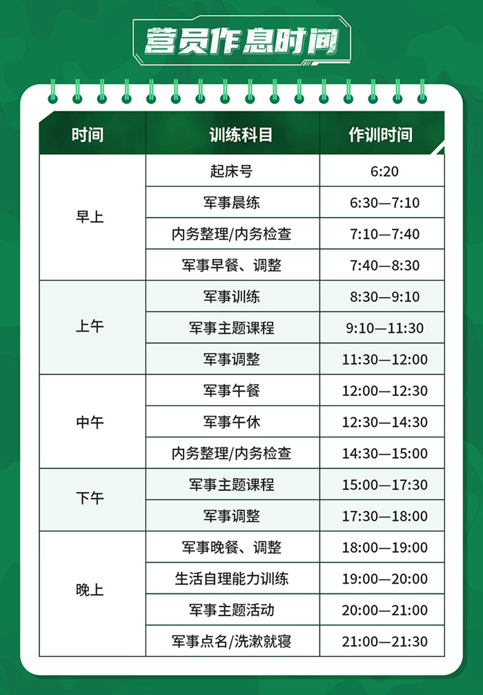 住宿标准:标准军营营房8-12人间,军用四件套、24小时空调、脸盆等