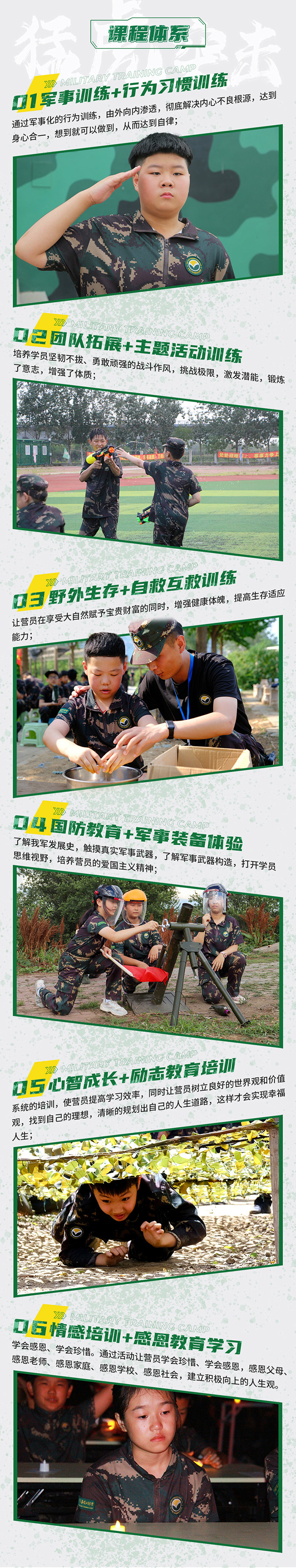 主要通过沉浸式军事特色系列课程:军事行为习惯训练、军事游戏及拓展、野外生存、安全自救、军事装备体验、感恩教育、军事特色科目训练(海军旗语、军体拳、野外单兵作训、格斗技巧等)等,历练营员的身心,让营员更具挑战力、行动力、竞争力,从而多元化提升营员的综合素质。