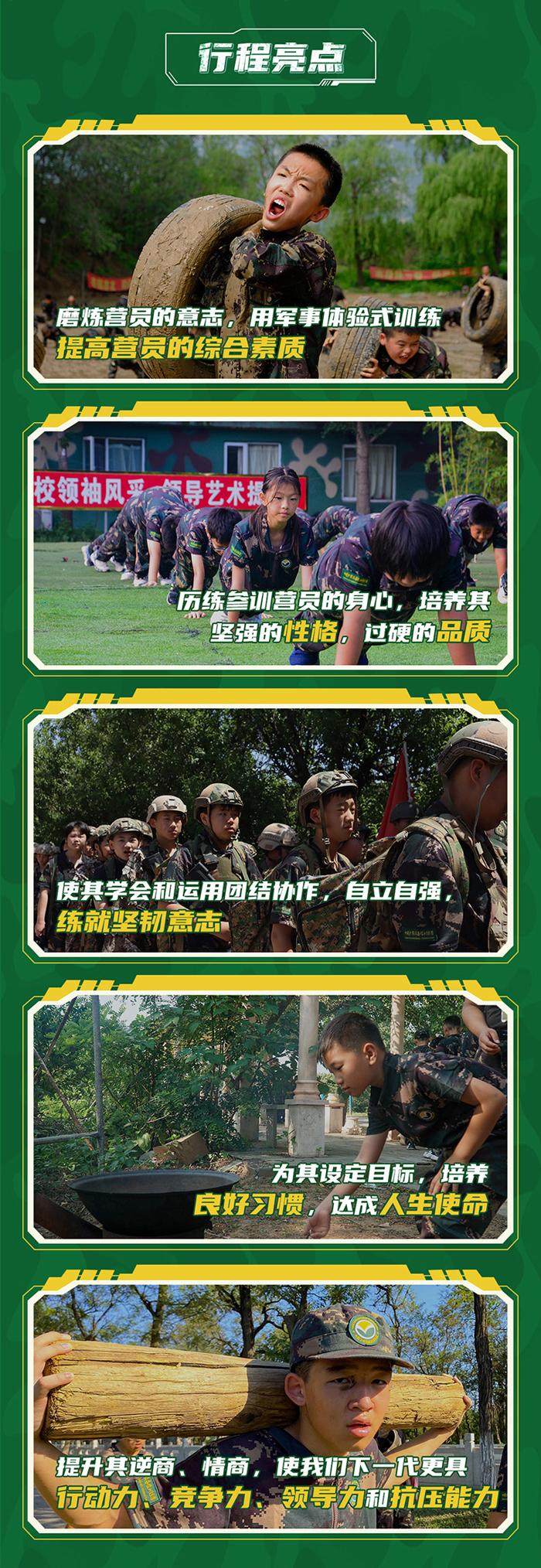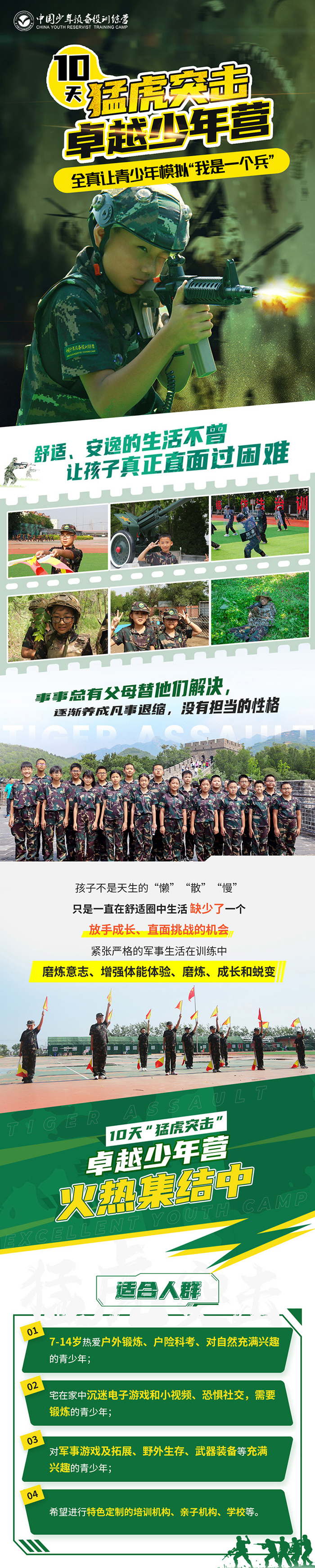 通过沉浸式的军旅主题课程活动,国际童军先进教学理念,系统化的军事课程体系,实战化的训练科目,让营员感觉更有挑战性及刺激性,激发营员领导思维及抗挫性,养成好习惯的同时多元化提升营员的综合素质。