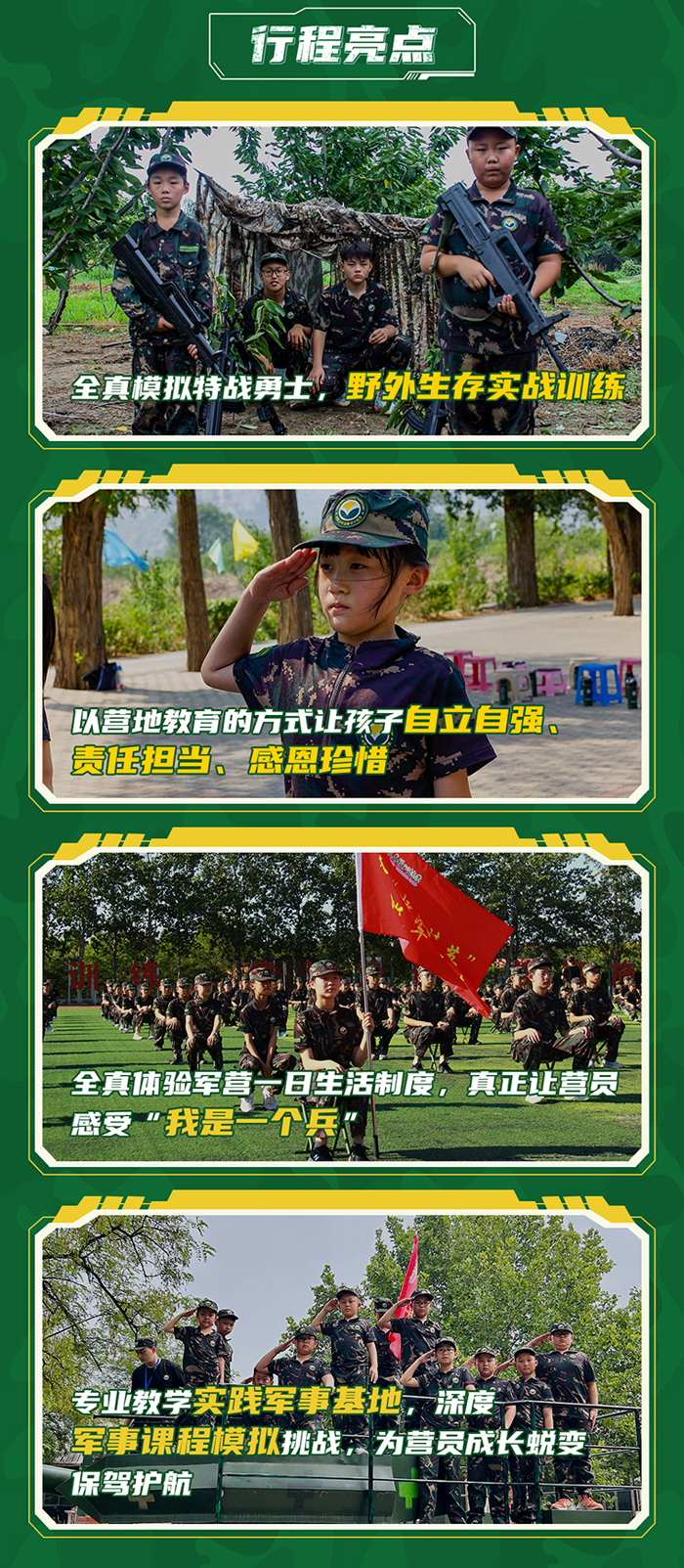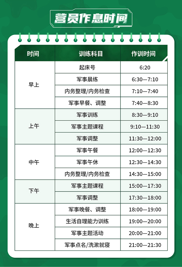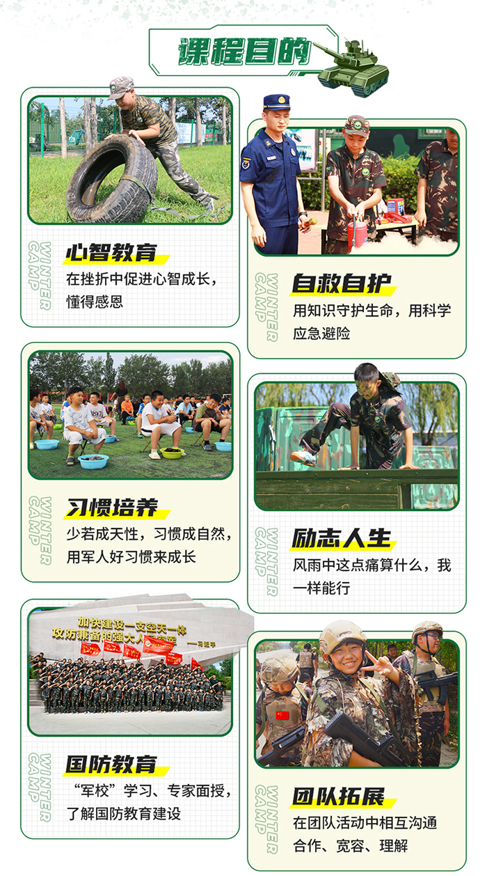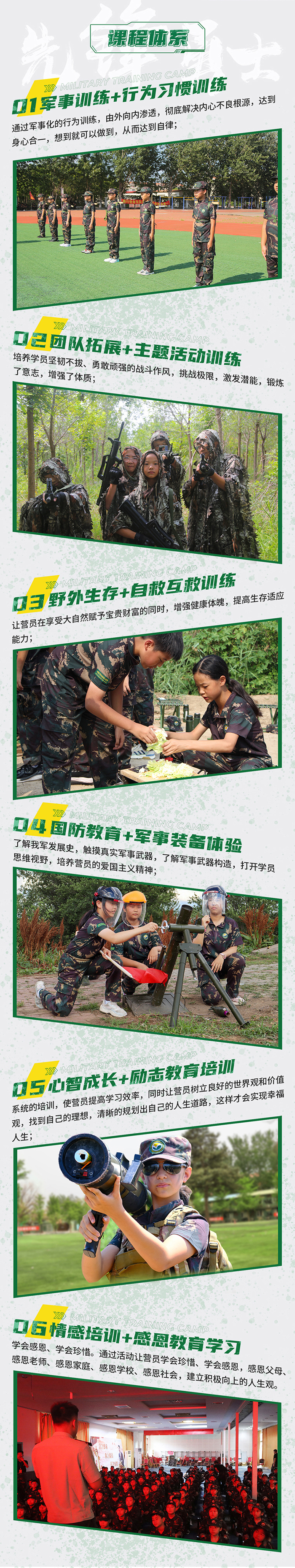 以军事基础训练为主训科目,结合军事装备体验、军体拳、海军旗语特训、野外拉练、战地安全自救、国防心智成长课等体验式军事系列课程,帮助营员感受军事文化、体验军事技能、学会独立自强,提高营员行为习惯、行为规范、时间观念、纪律观念以及独立性培养。