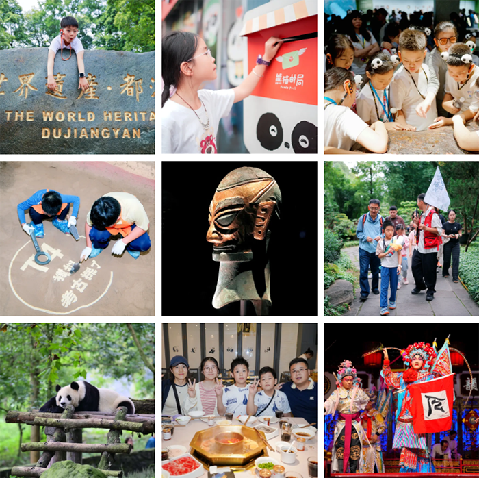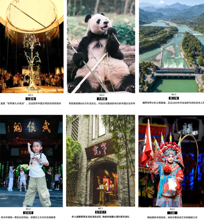 成都、四川博物院、人民公园、宽窄巷子、时光邮局、中国大熊猫保护研究中心、都江堰水利工程、三星堆博物馆、三星堆青铜工坊、武侯祠