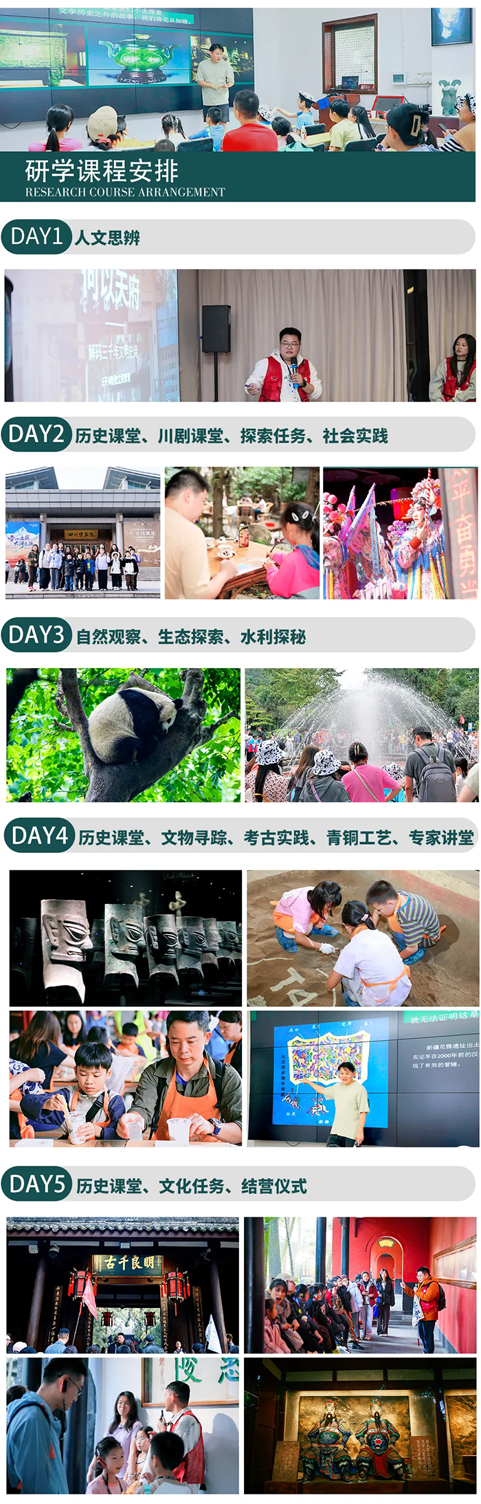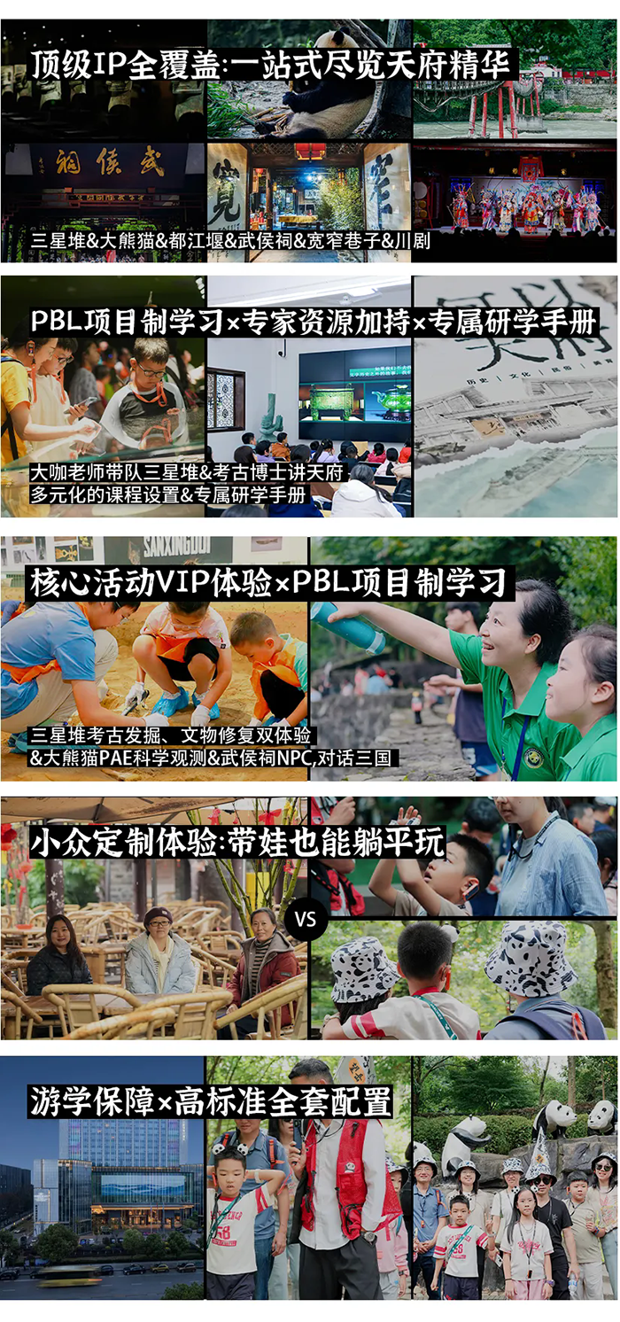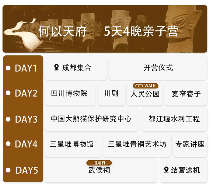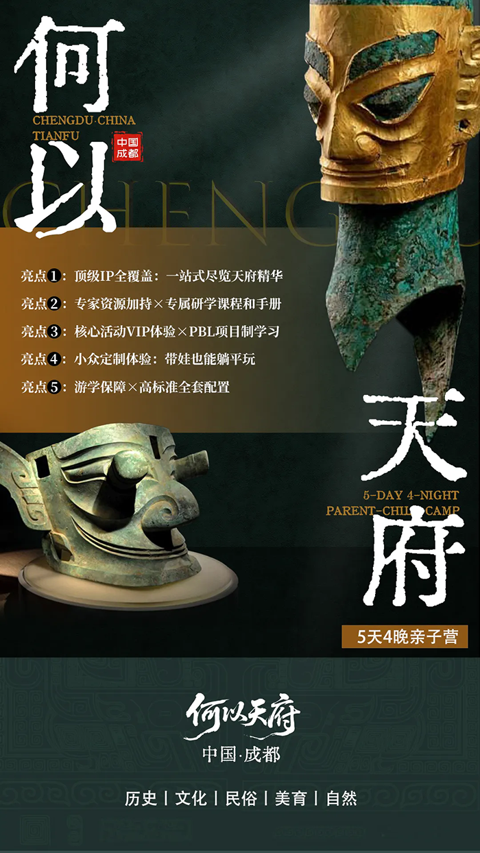 整趟旅程是—场沉浸式文化考古,孩子们将像考古学家—样,每日挖掘—个文化基因片段,完成从“碎片”到“图谱”的整合,构建对成都立体而完整的理解,获得可迁移的思维方式和文化洞察力