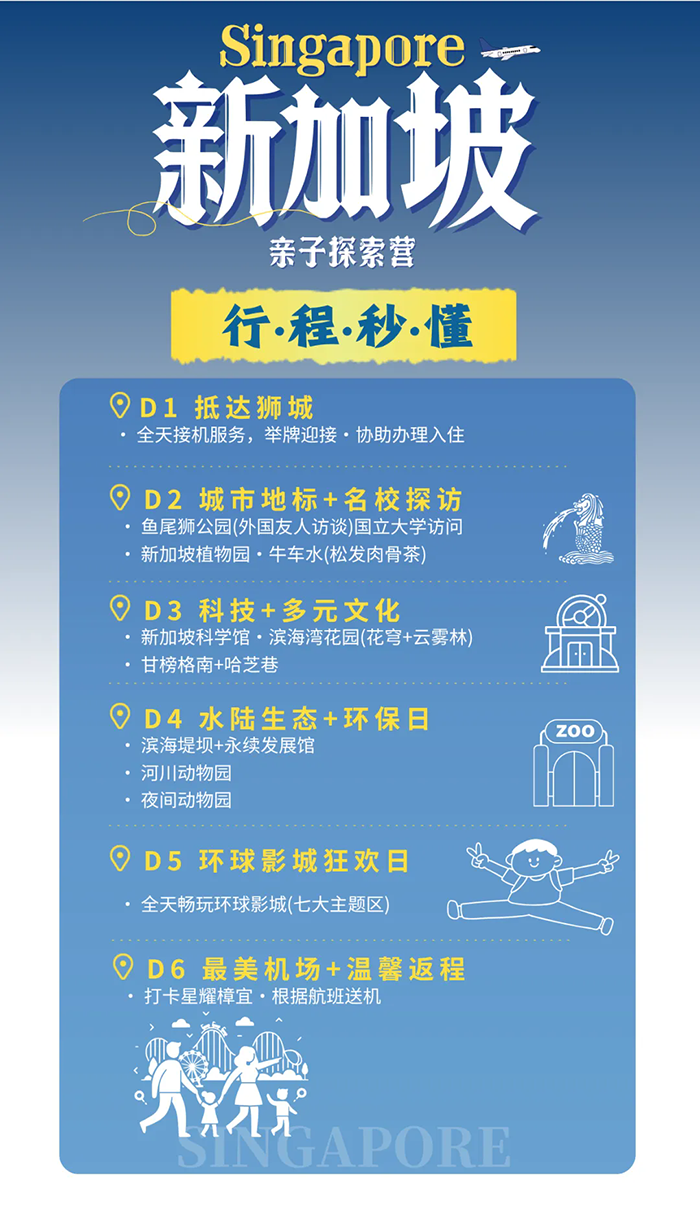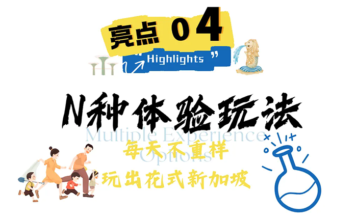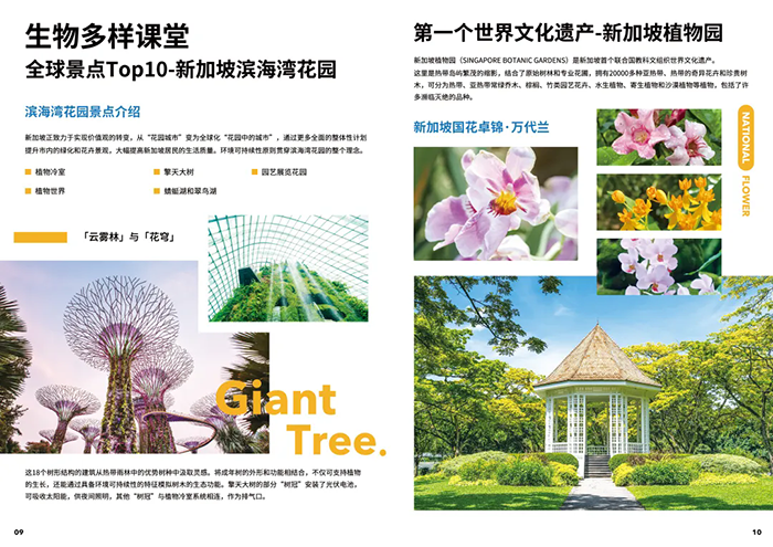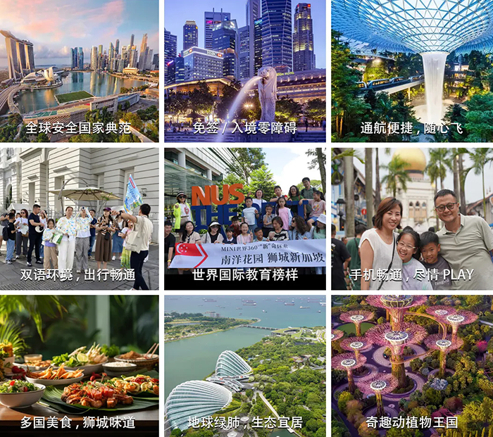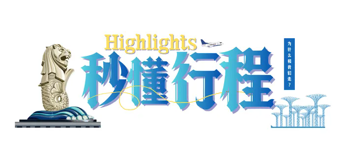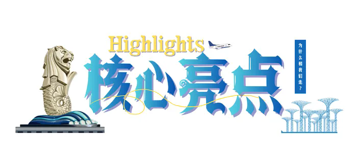 鱼尾狮公园、国立大学、新加坡植物园、牛车水、新加坡科学馆、 滨海湾花园、甘榜格南+哈芝巷、滨海堤坝+永续发展馆、河川生态园、夜间动物园、环球影城、世界最美机场
