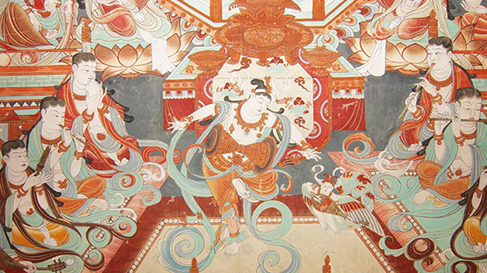 敦煌莫高窟开凿于十六国,历经了北凉、北魏、西魏、北周、隋、唐等朝代,保存了这些朝代的大量壁画,共有洞窟735个,壁画4.5万平方米、泥质彩塑2415尊。