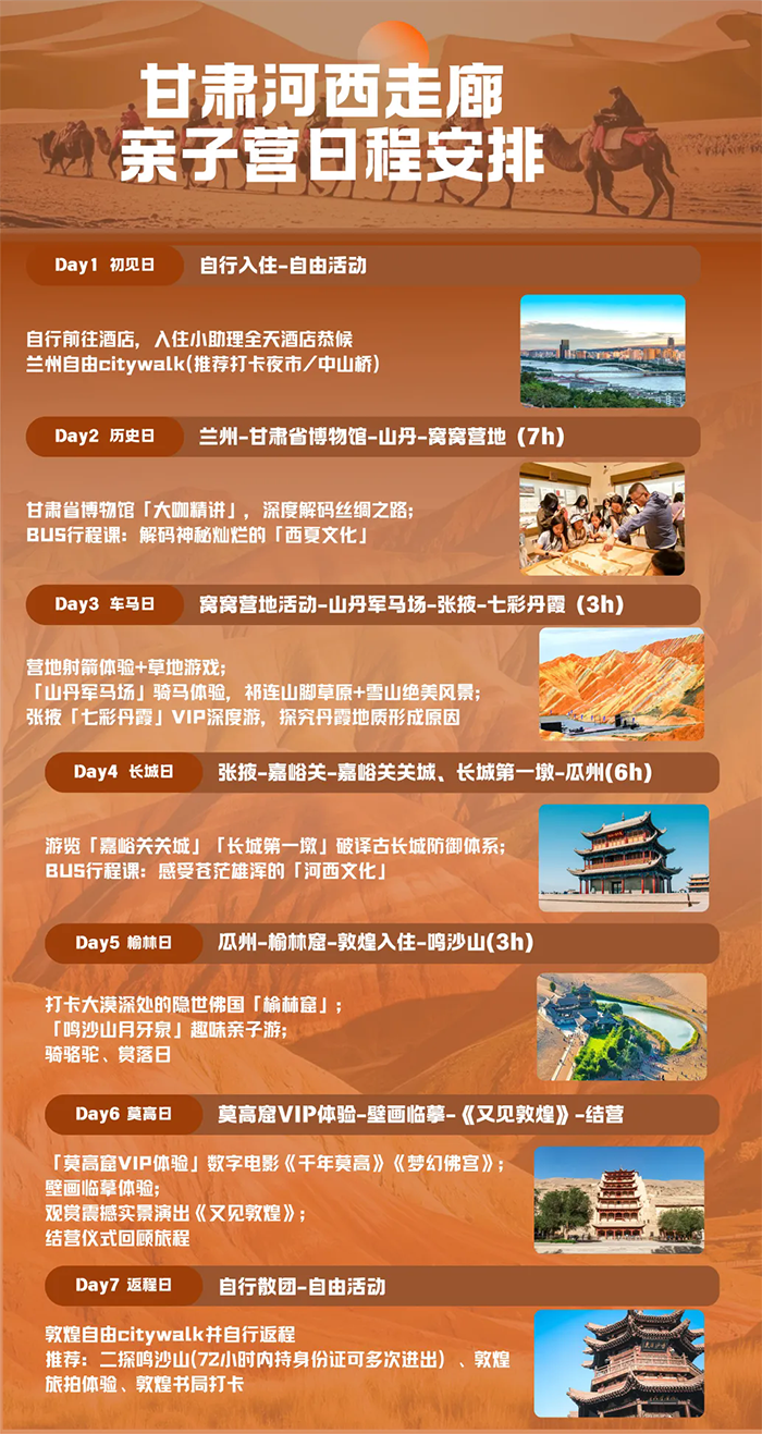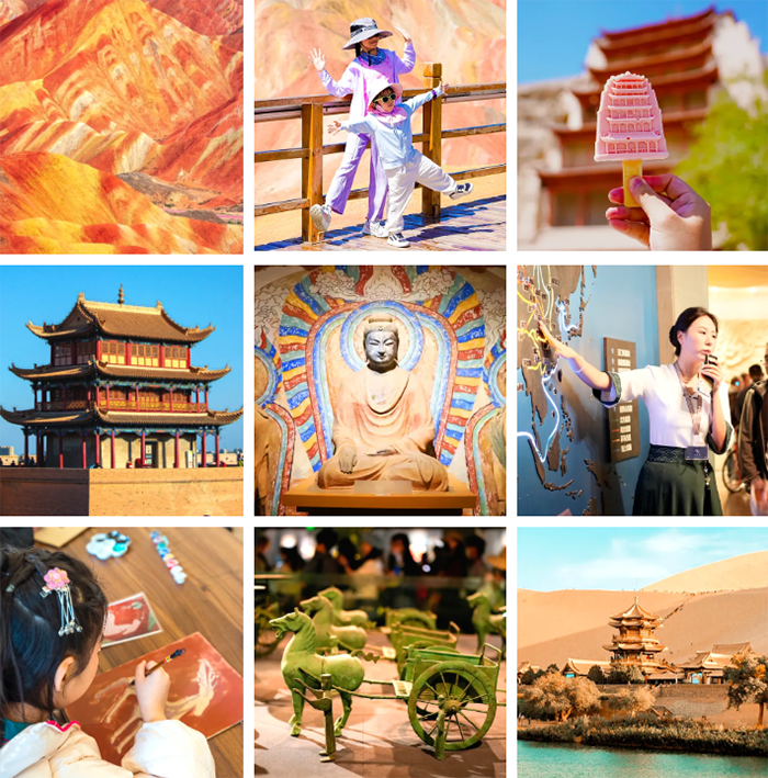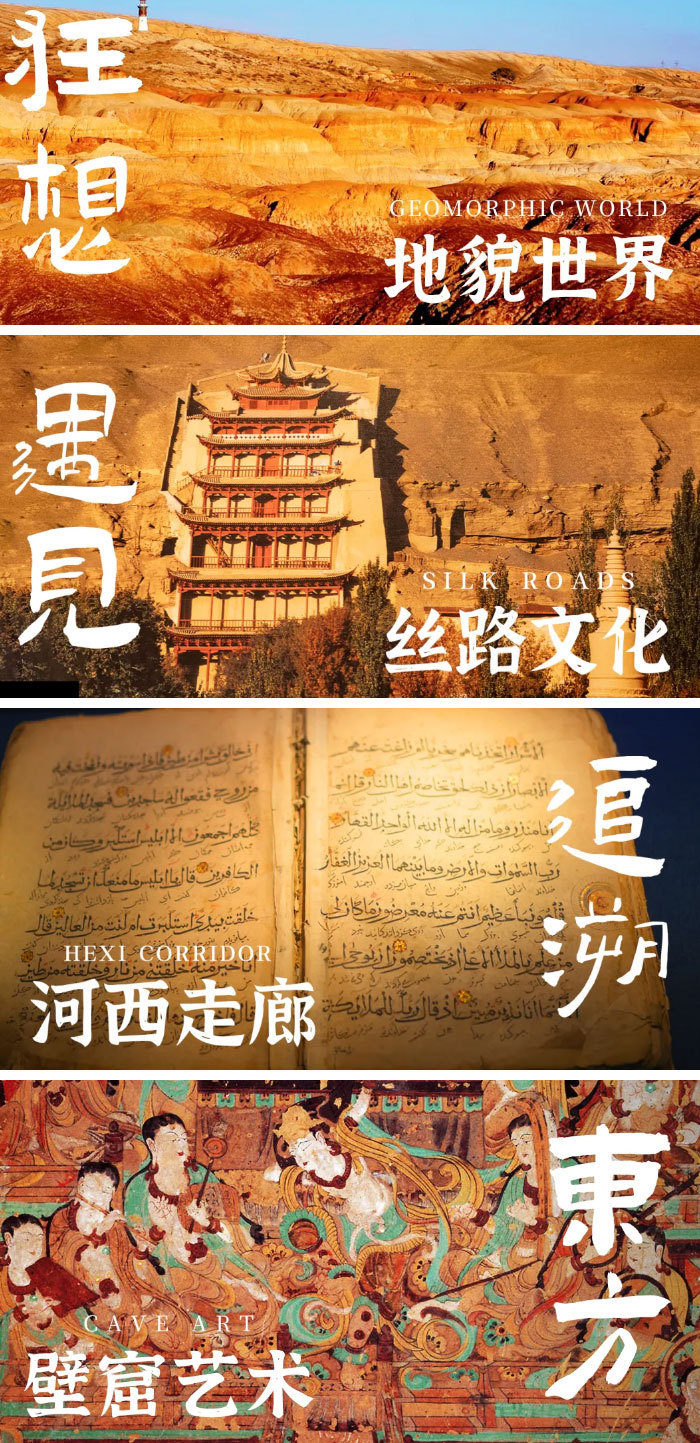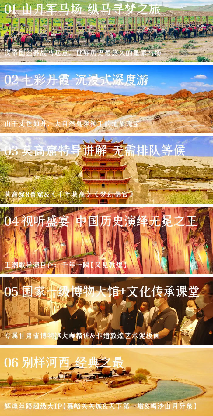 兰州、甘肃省博物馆、山丹军马场、张掖丹霞、嘉峪关、嘉峪关关城、长城第一墩、瓜州榆林窟、敦煌莫高窟、鸣沙山月牙泉、敦煌书局