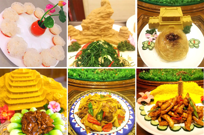 热菜:莫高驼云掌,五彩驼峰丝,西域汗蒸羊排,虫草虹鳟鱼,胡杨卷云被,戈壁滩上汽泡鸡,鸣沙山下枣,沙漠神葱野鸡蛋,普度麦仁,绿洲百合花