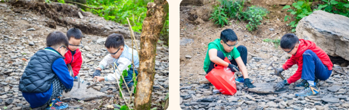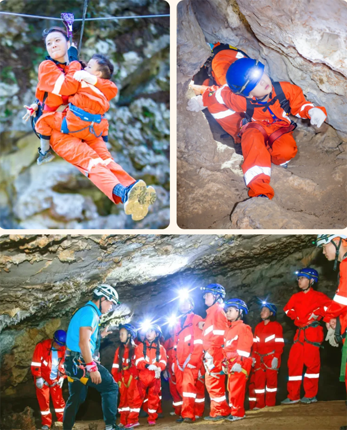 选择更适合亲子的难度适宜且富有挑战的洞穴,统一的探险连体服、安全帽、手套,