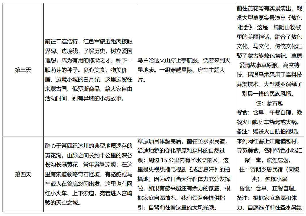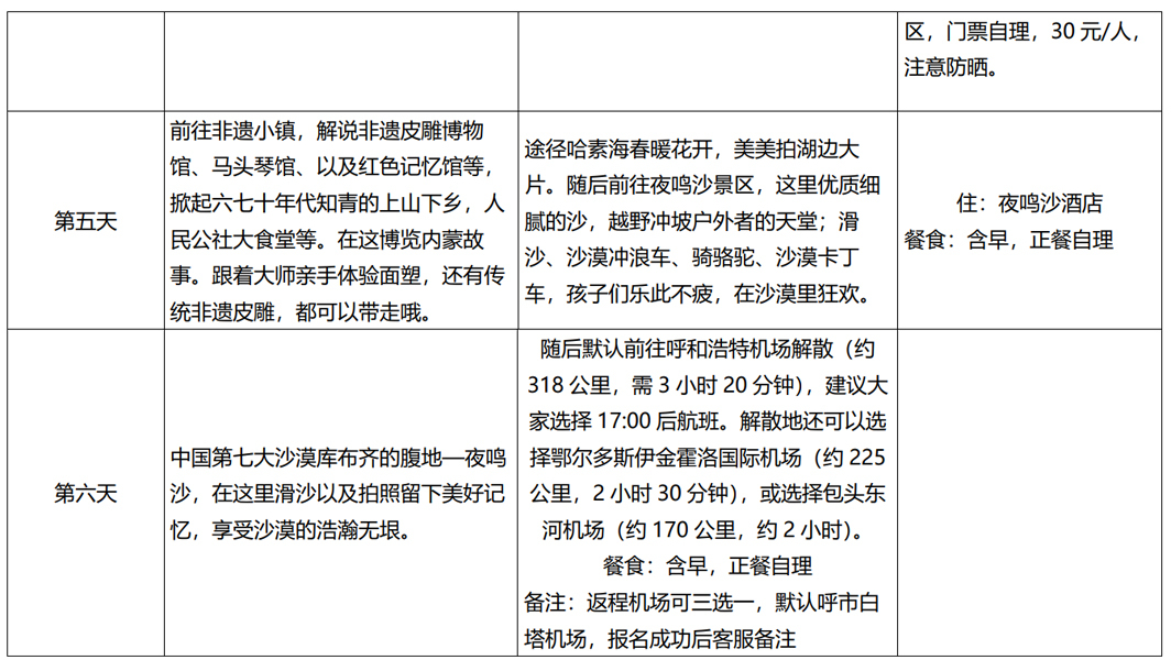 3、门票:夜鸣沙、黄花沟(含往返索道及景交)、二连恐龙地质公园、二连浩特、非遗小镇;