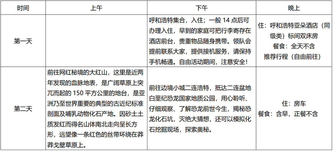 活动地点:大红山、二连盆地白垩纪恐龙国家地质公园、二连浩特,乌兰哈达火山、黄花沟、圣水梁、恼包村、非遗小镇、哈素海、夜鸣沙