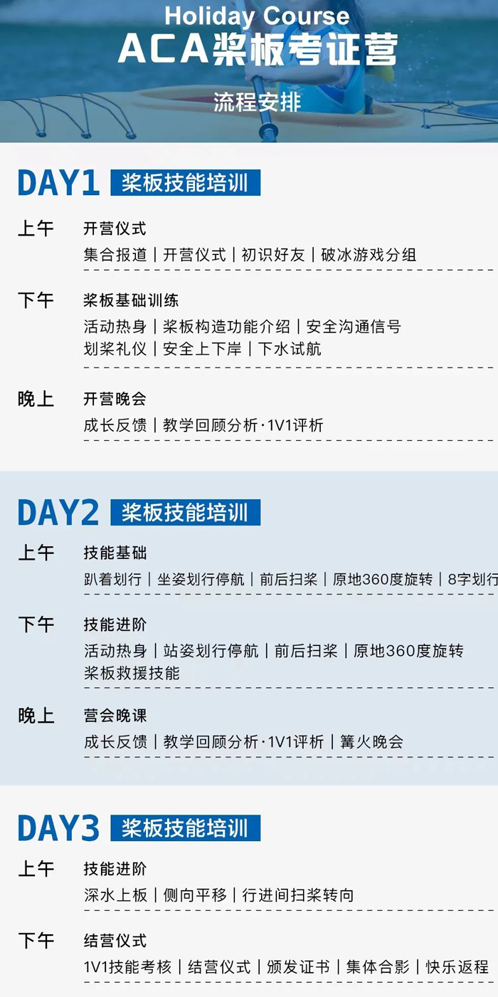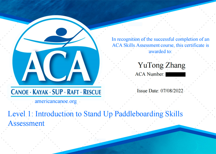 一级考核的成绩将上报美国皮划艇协会,通过者获得ACA皮划艇一级或ACA桨板一级证书,非常适合0基础孩子。